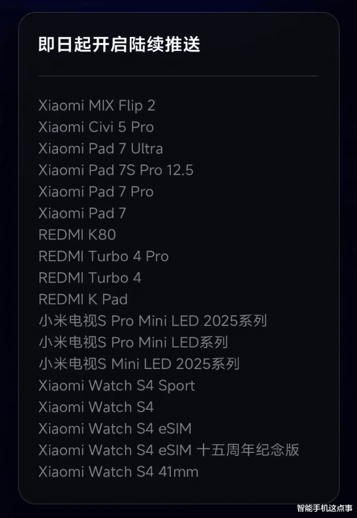 平板方面,则包括小米平板7 Ultra、Pad 7S Pro 12.5、Pad 7 Pro、Pad 7和REDMI KPad。另外,还有一些电视和可穿戴设备也加入了更新行列,比如小米电视S Pro Mini LED系列和Xiaomi Watch S4系列。